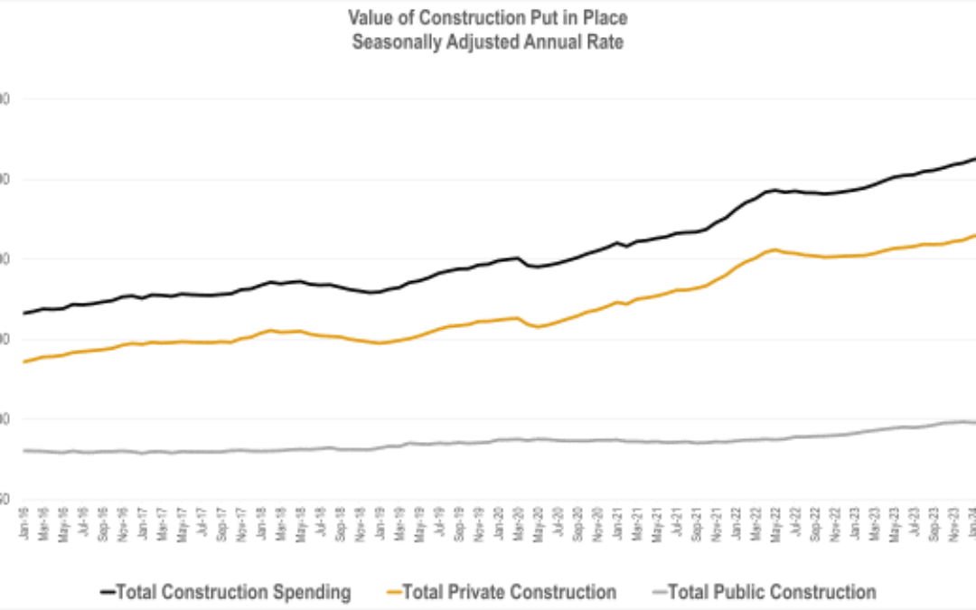 Recently, the US Census released the results of its monthly Value of Construction Put in Place Survey. The survey provides estimates of the total dollar value of construction work done in the U.S. This data includes design and construction spending for public and private projects.